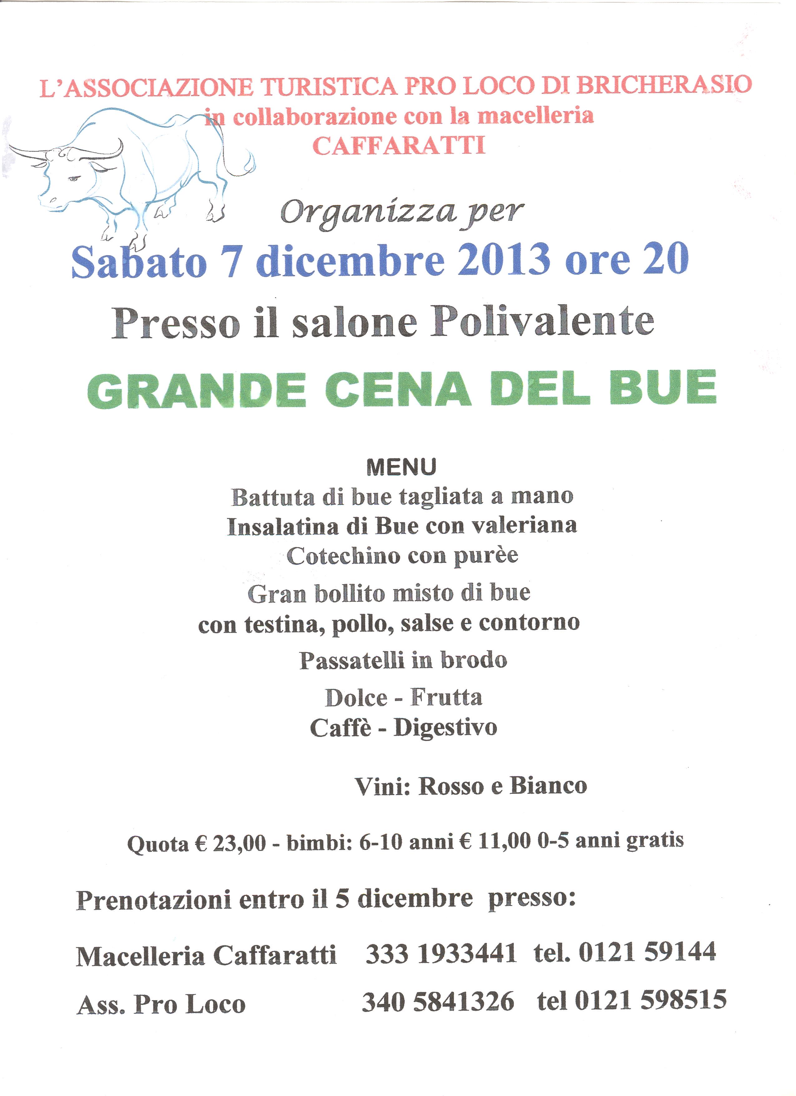 L’Associazione Turistica Pro Loco di Bricherasio in collaborazione con la Macelleria Caffaratti organizza per sabato 7 dicembre alle ore 20.00 presso il Salone Polivalente di Via Vittorio Emanuele II, 94 a Bricherasio, la classica grande cena del bue giunta alla dodicesima edizione con bollito misto alla piemontese con un menù costituito, per la maggior parte delle portate, appunto dal bue bricherasiese. La quota di partecipazione per gli adulti è di € 23.00 mentre per i bimbi dai 6 ai 10 anni è di € 11,00. Per informazioni e prenotazioni entro giovedì 5 dicembre rivolgersi all’Associazione Pro Loco ai numeri 340/5841326 e 0121/598515 oppure alla Macelleria Caffaratti allo 0121/59144 e 333/1933441. La manifestazione rientra nella XV edizione del “Natale in allegria” bricherasiese.